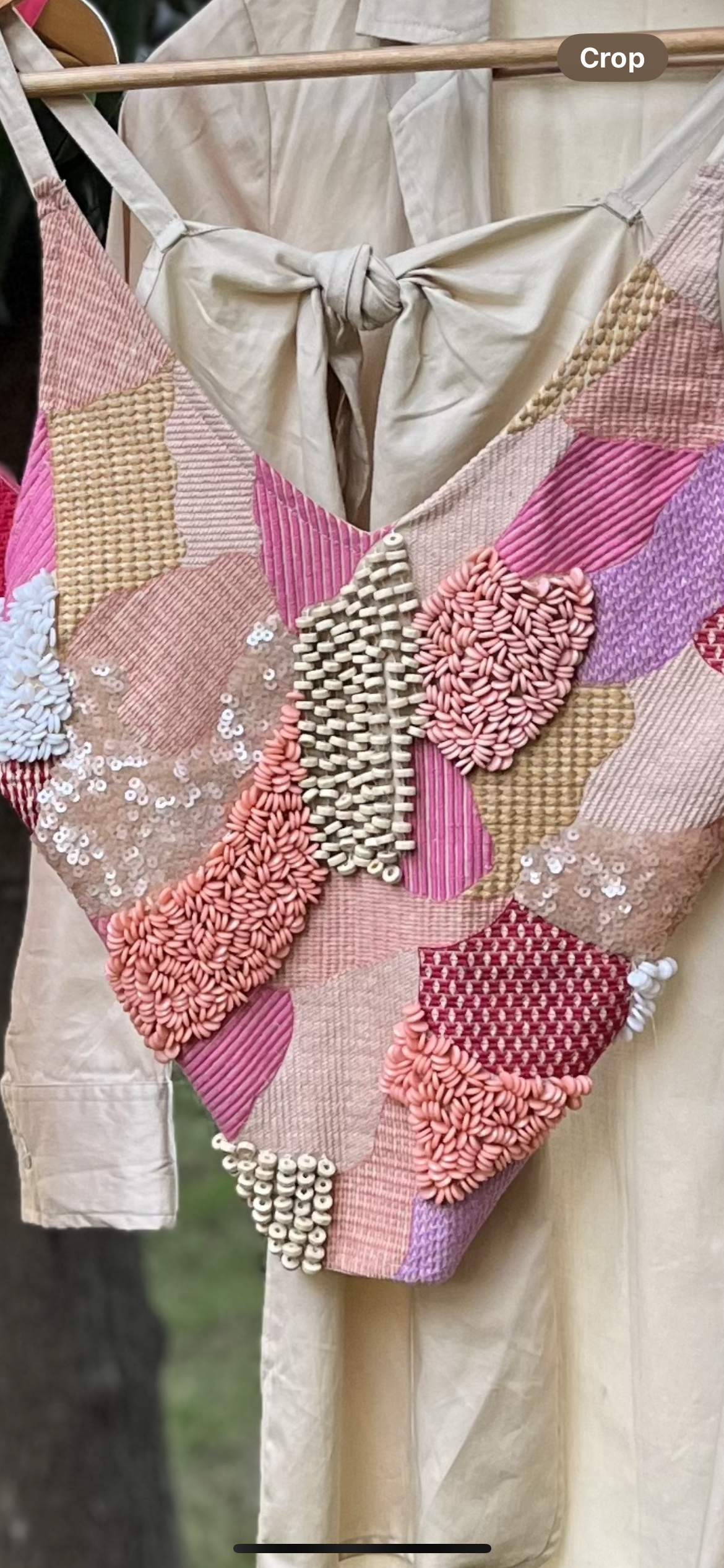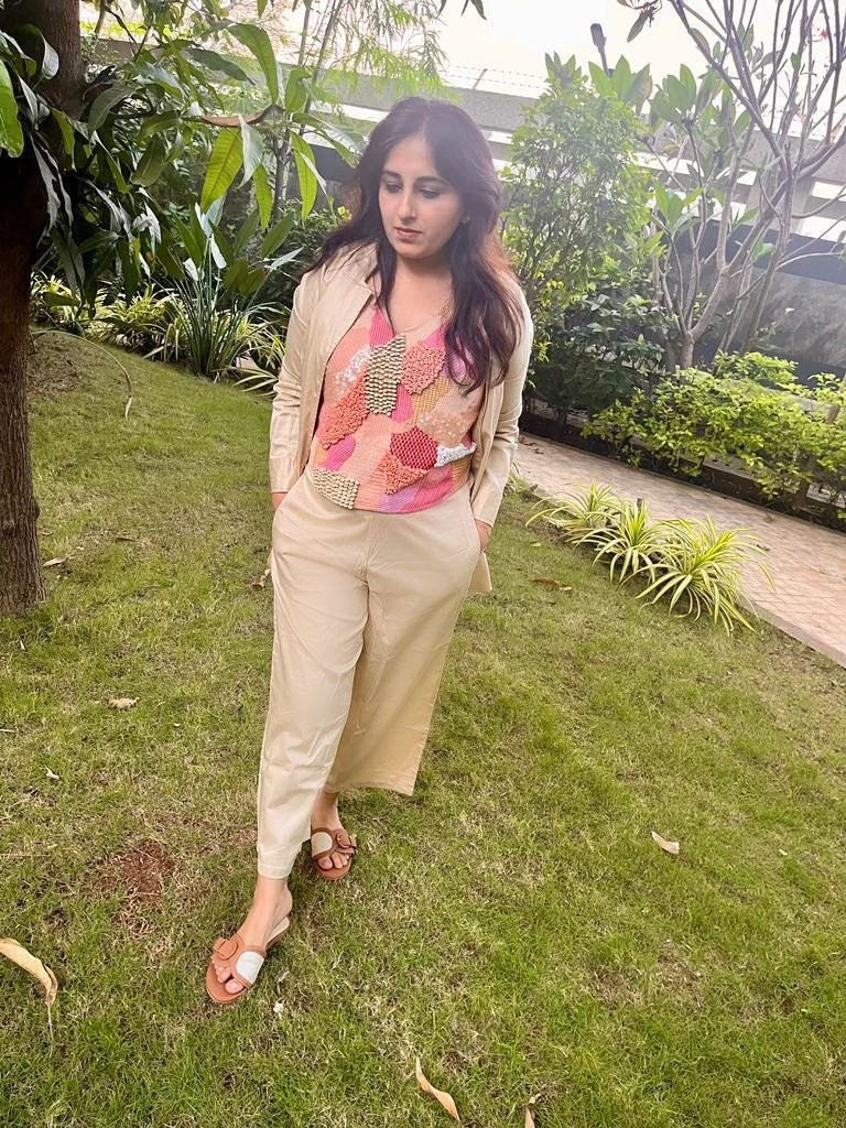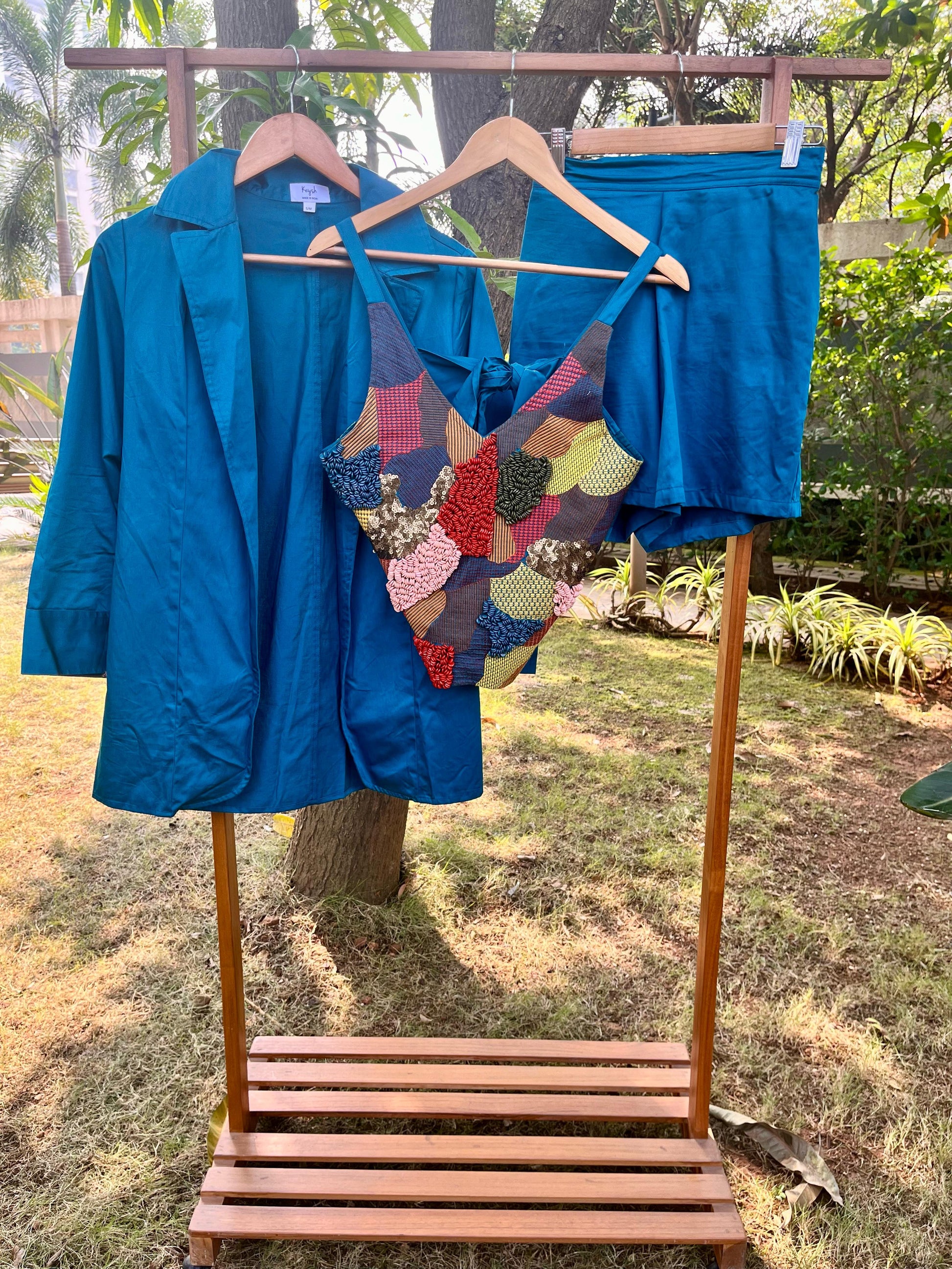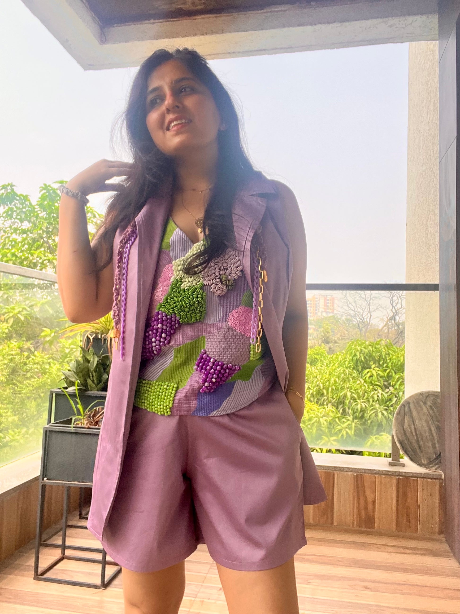 An abstract tie knot top styled with a casual blazer and shorts or pants.
