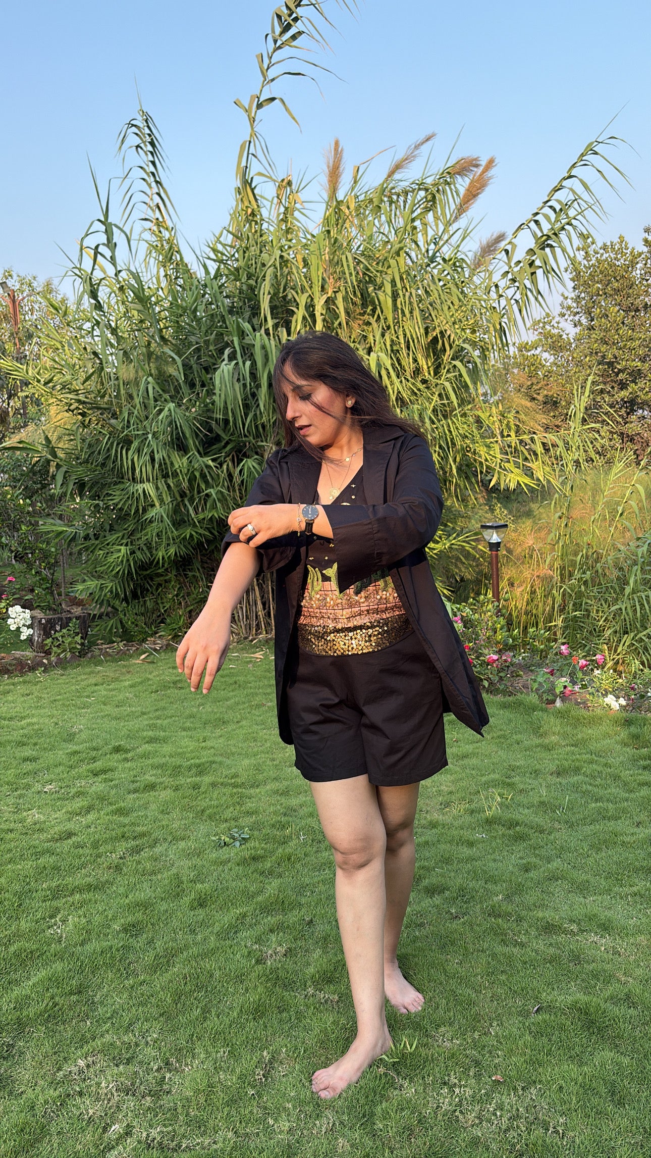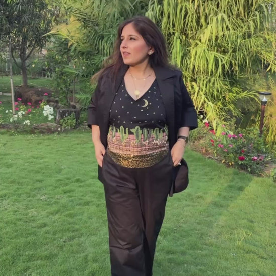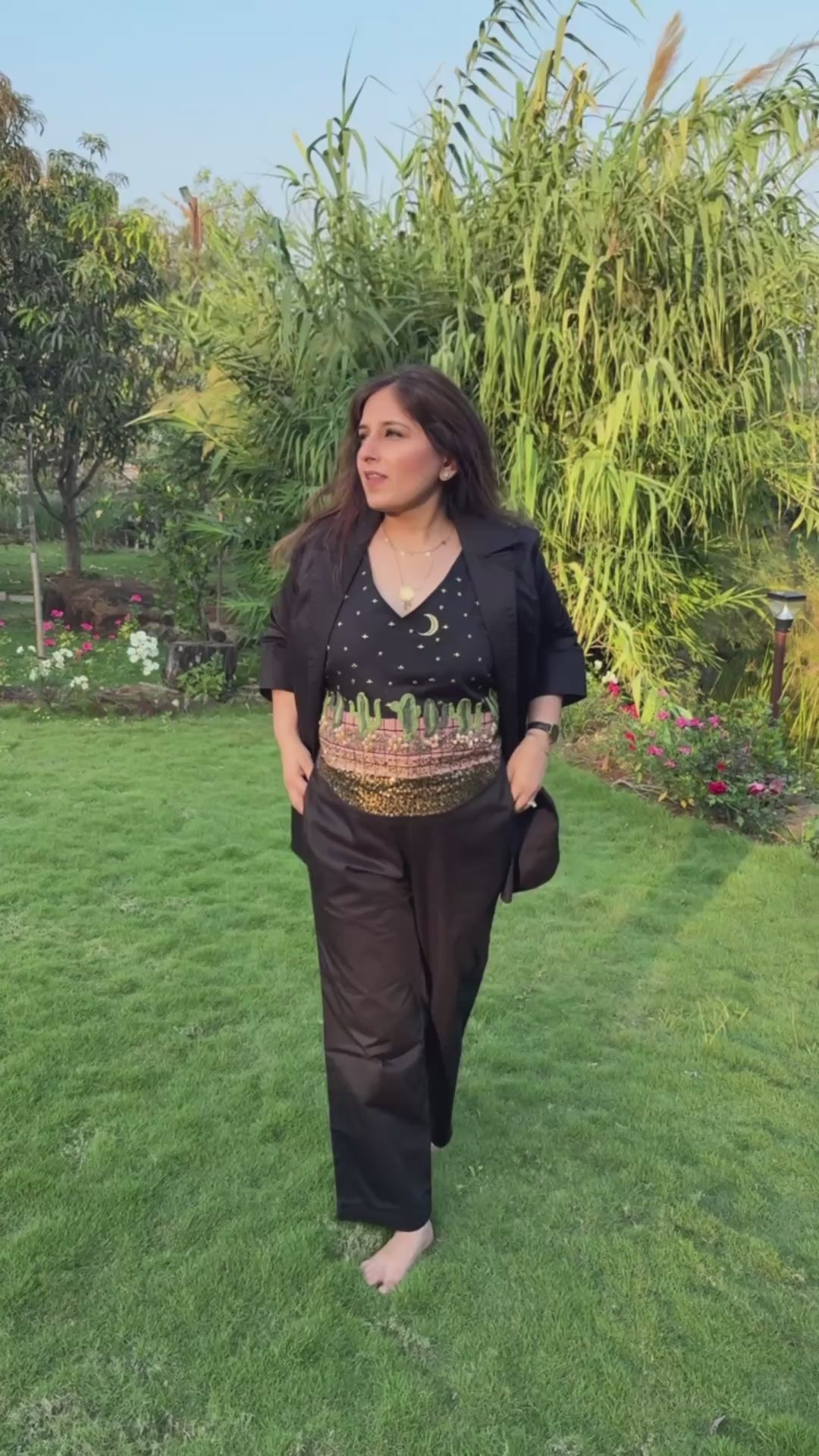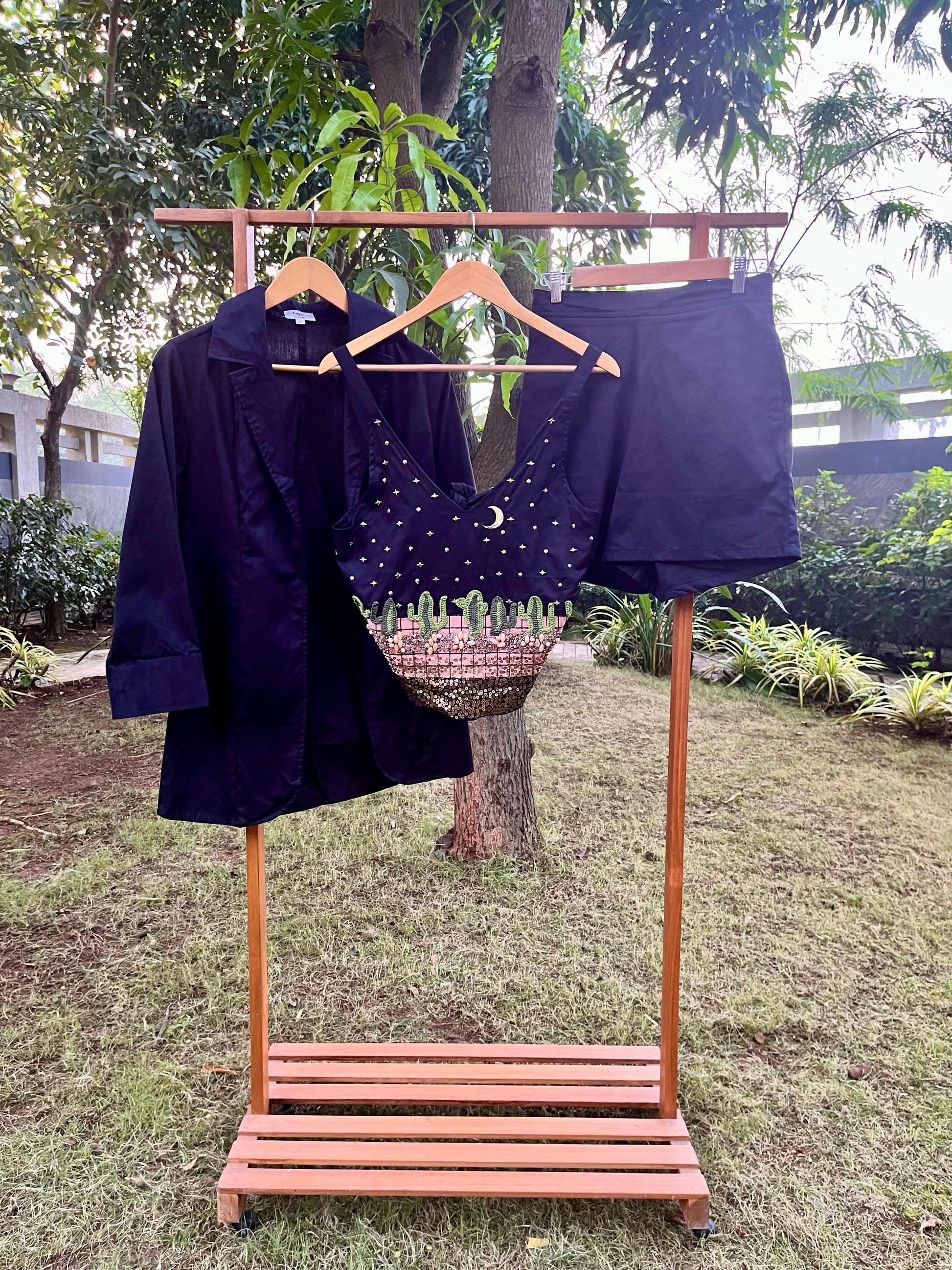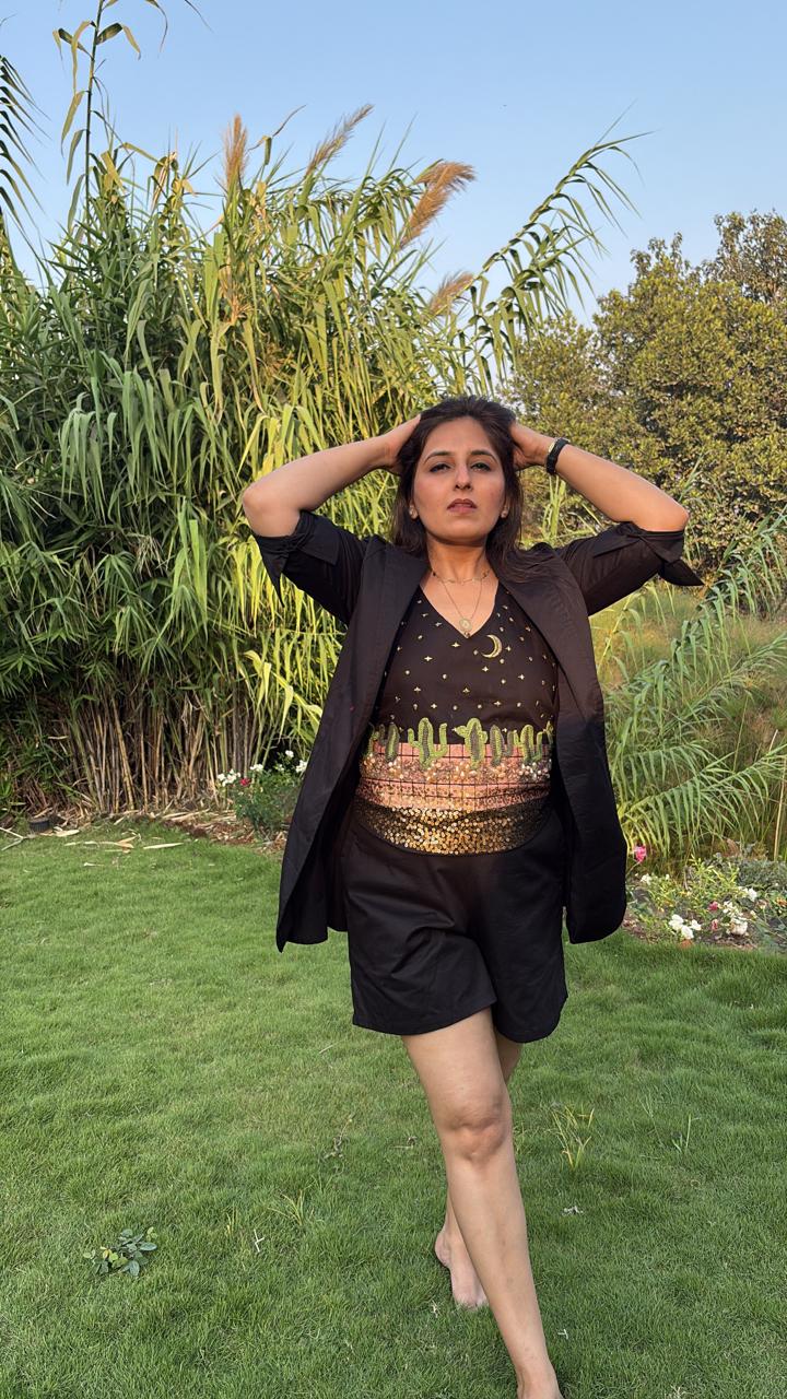 "A tie-knot top adorned with crochet cacti and delicate pink embroidery along the base; paired with long sleeve Blazer and shorts or pants "
