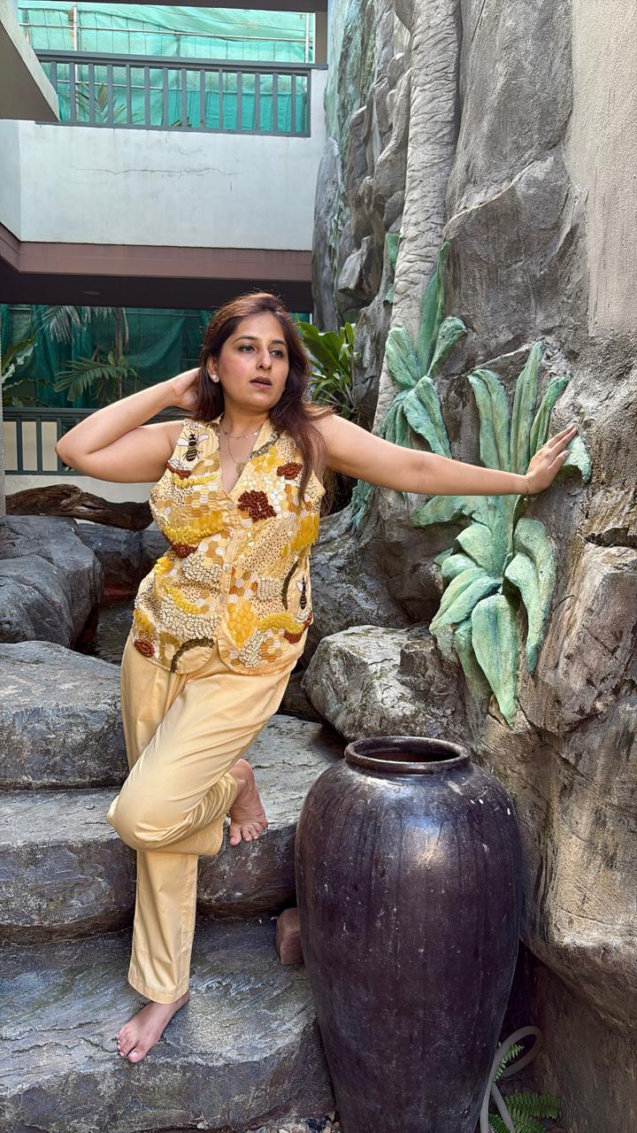 Honeybee /Honeycomb embroidered V-neck waistcoat featuring a belt for a tailored fit, paired with pleated pants that combine a half-belt and elastic waistband for added comfort. The top is lined with soft cotton, and the ensemble is crafted from durable, all-weather suiting fabric made of 100% cotton twill