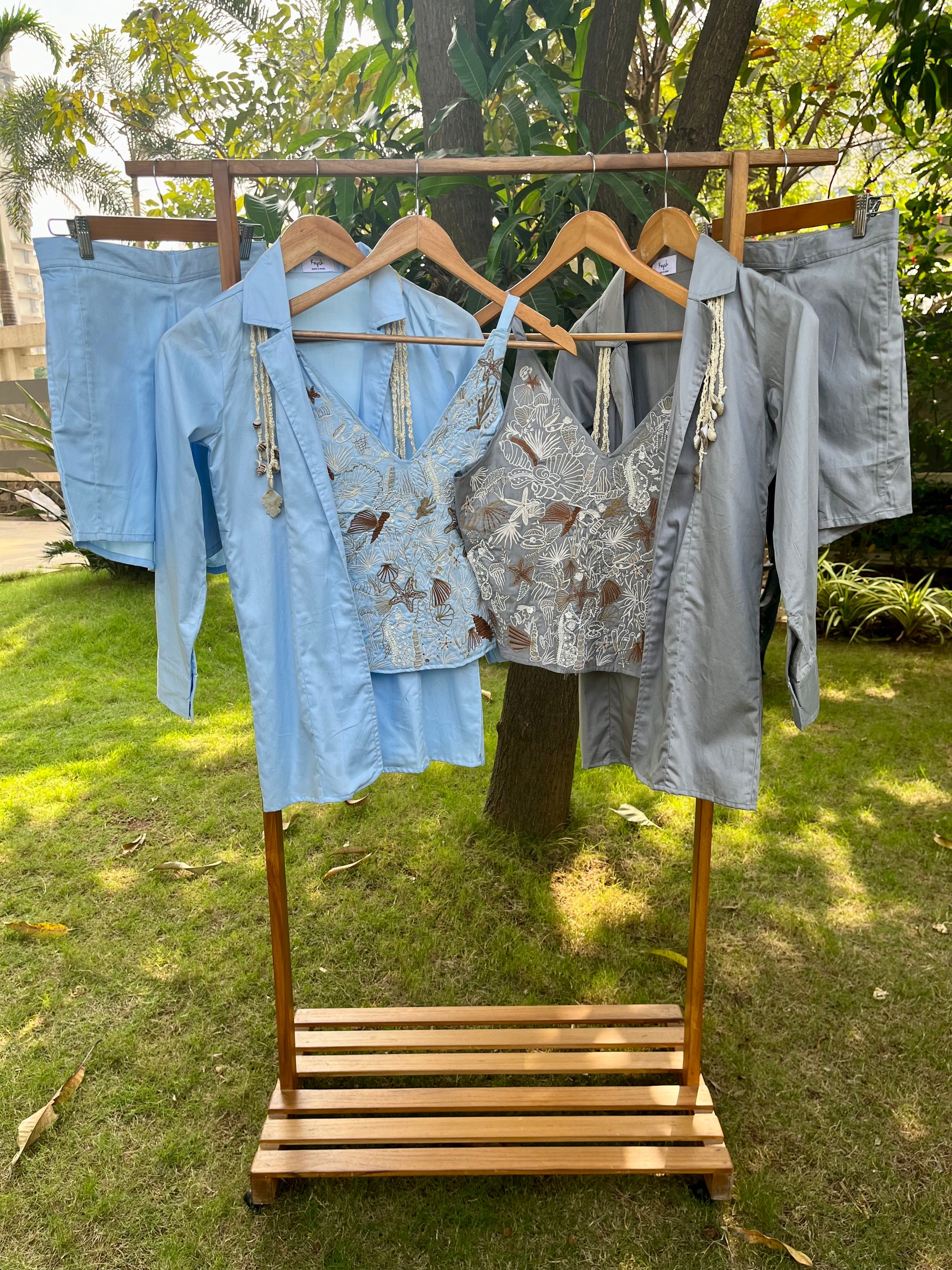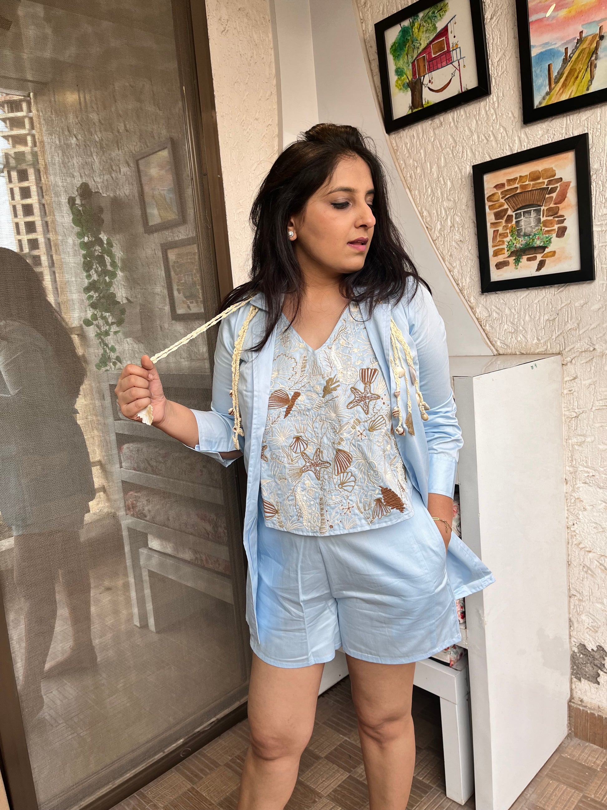 Ocean inspired embroidered tie knot top paired with casual Blazer and Shorts/Pants